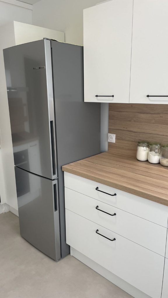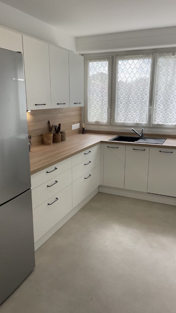 Cette réalisation concerne l’aménagement complet d’une cuisine PMR, pensée pour faciliter l’autonomie et l’usage quotidien. Les meubles hauts ont été équipés d’un système de descente variable, permettant leur positionnement à hauteur de plan de travail.