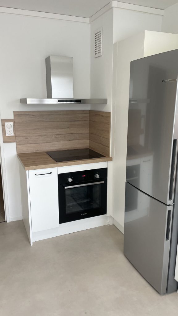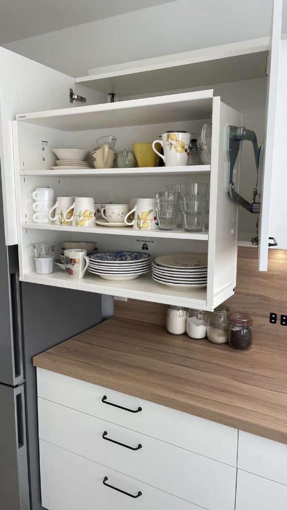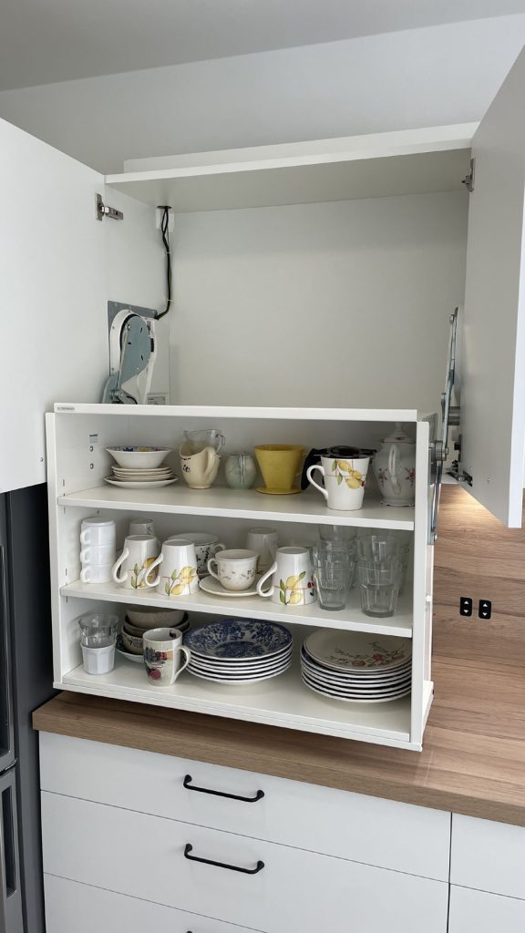 La descente s’effectue en douceur, par télécommande ou directement depuis le plan de travail, selon les besoins de l’utilisateur. L’ensemble combine fonctionnalité, sécurité et confort d’utilisation, tout en conservant une esthétique soignée et un agencement pratique adapté à l’espace disponible.