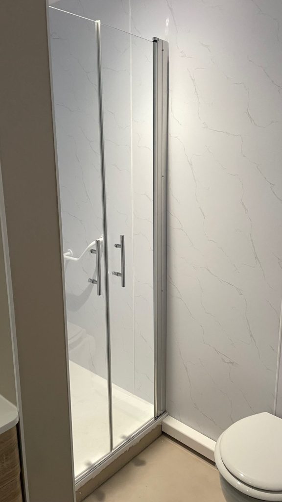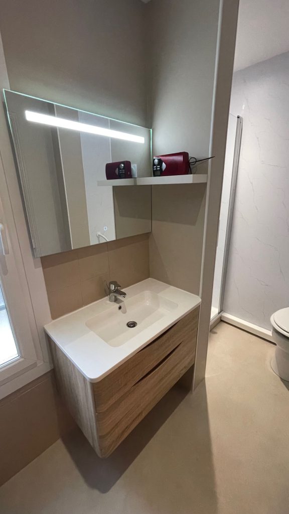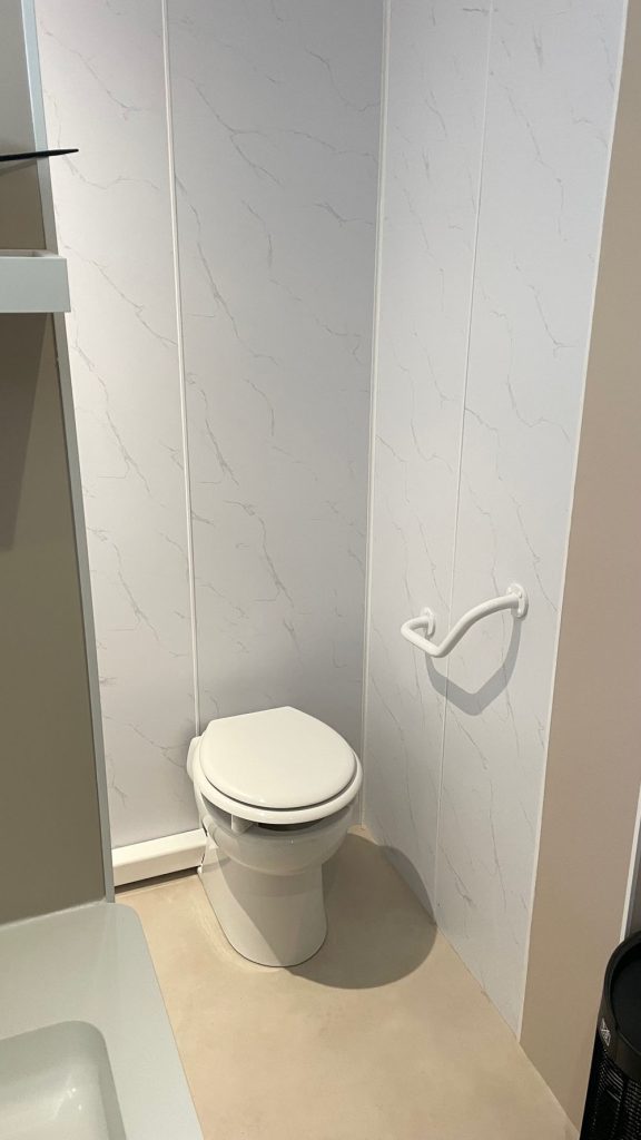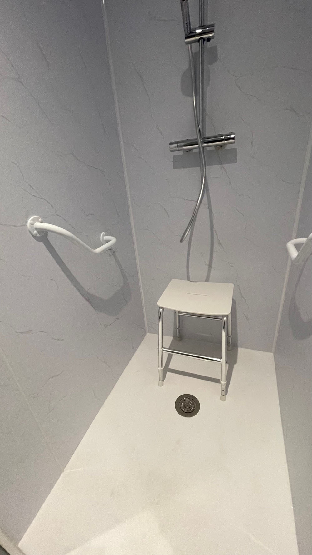 Ce projet met en avant la création d’un espace de douche et d’une salle de bain adaptés aux personnes à mobilité réduite (PMR). L’intervention a consisté à installer une douche PMR avec receveur antidérapant, pour assurer la sécurité lors de l’utilisation. Des panneaux muraux ont été posés en périphérie afin d’obtenir une finition esthétique, durable et facile d’entretien.